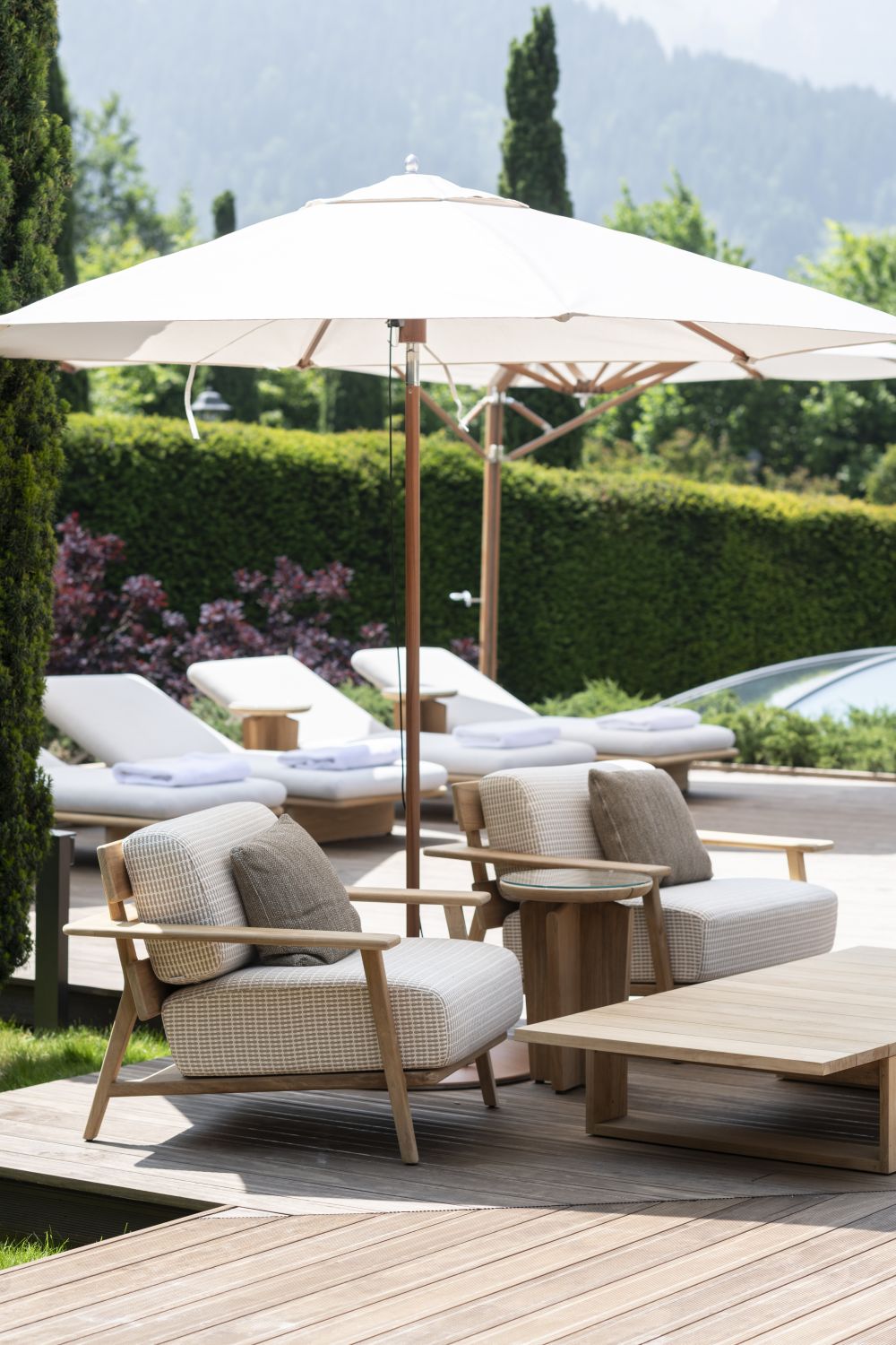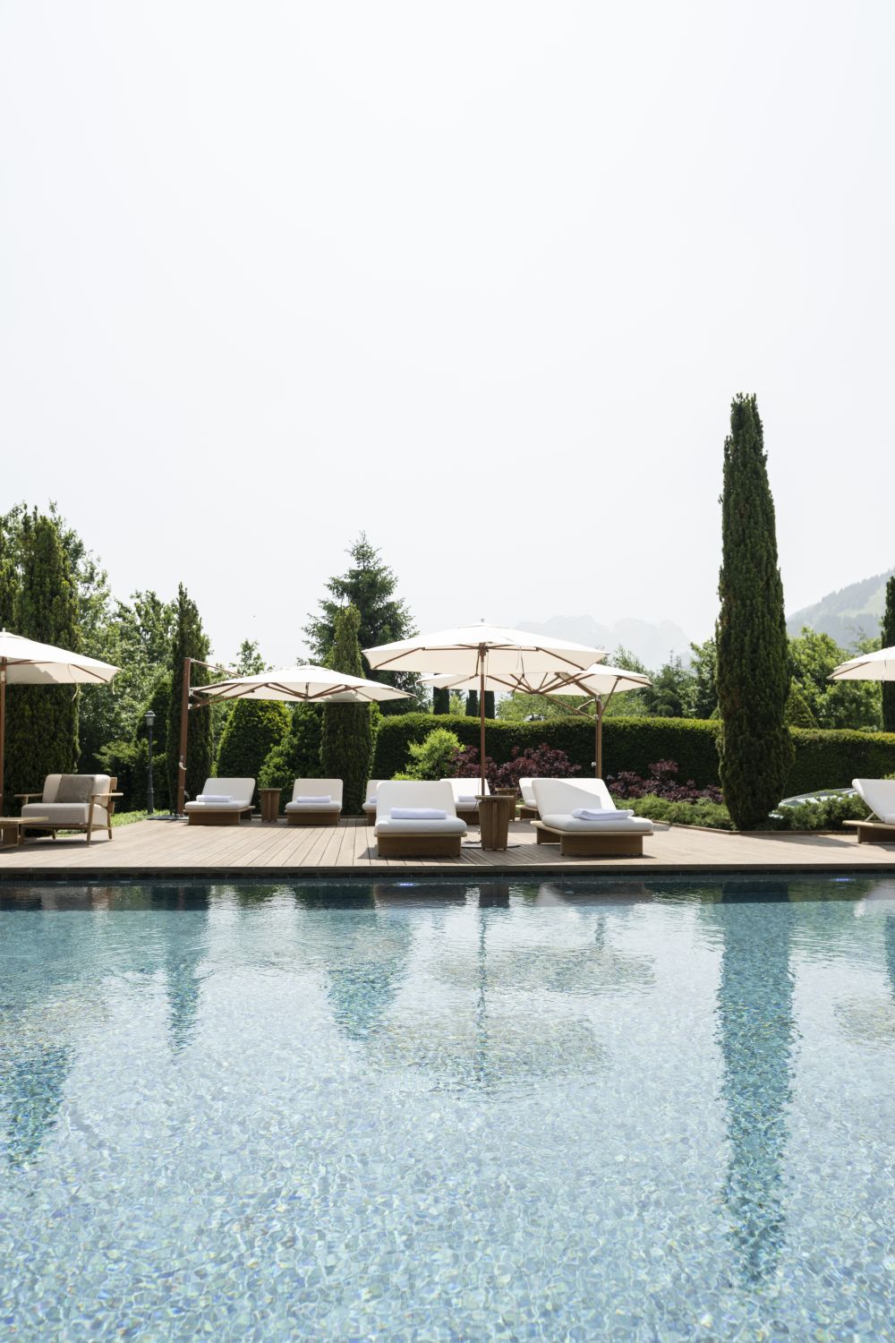 Besides the pool, cream chaise loungers glow like winter snow. The matching parasols mirror the Alpine peaks in the distance. The stone and wood bar evokes the surrounding mountains and forests. “The pool is encompassed by one of the most stunning landscapes in the world,” says Inge and Nathan. “It was important to us that the design didn’t compete with that.”