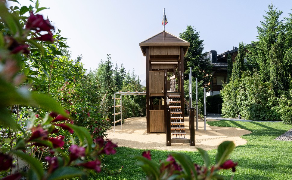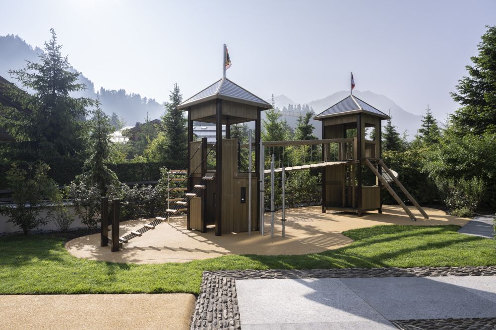 The playground took inspiration from The Alpina Gstaad’s design, which was heavily influenced by traditional Swiss architecture and the spectacular Alpine surroundings. Crafted with artisan wood in neutral tones, “the unique play tower beautifully blends into the breathtaking mountain landscape and the hotel’s towers,” says Roger Kilchör.